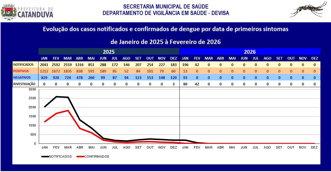 A redução também é notável no número total de notificações de dengue. Em janeiro de 2025, foram 2.041 registros de pessoas com sintomas compatíveis com a doença. Já em janeiro de 2026, esse número caiu para 196 — uma queda de mais de 90%.